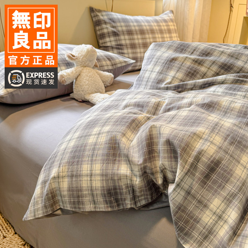 无印良品四件套全棉纯棉被套床单人三件套格子四季款双人床上用品
