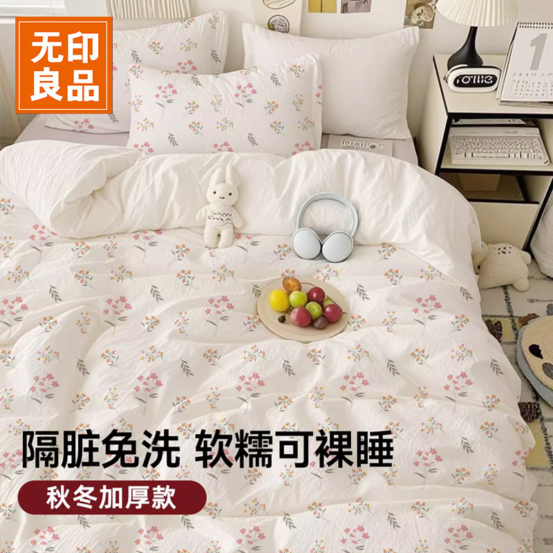 无印良品四件套全棉纯棉泡泡纱水洗棉床单被套床上用品三件套冬季