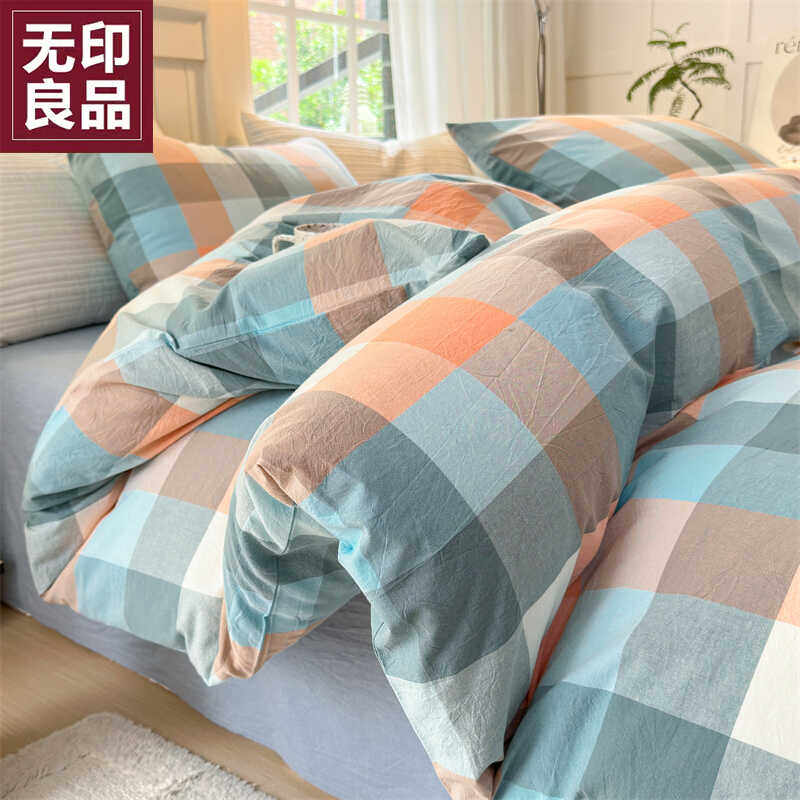 无印良品四件套纯棉全棉水洗棉格子被套床单床笠单人学生宿舍床品