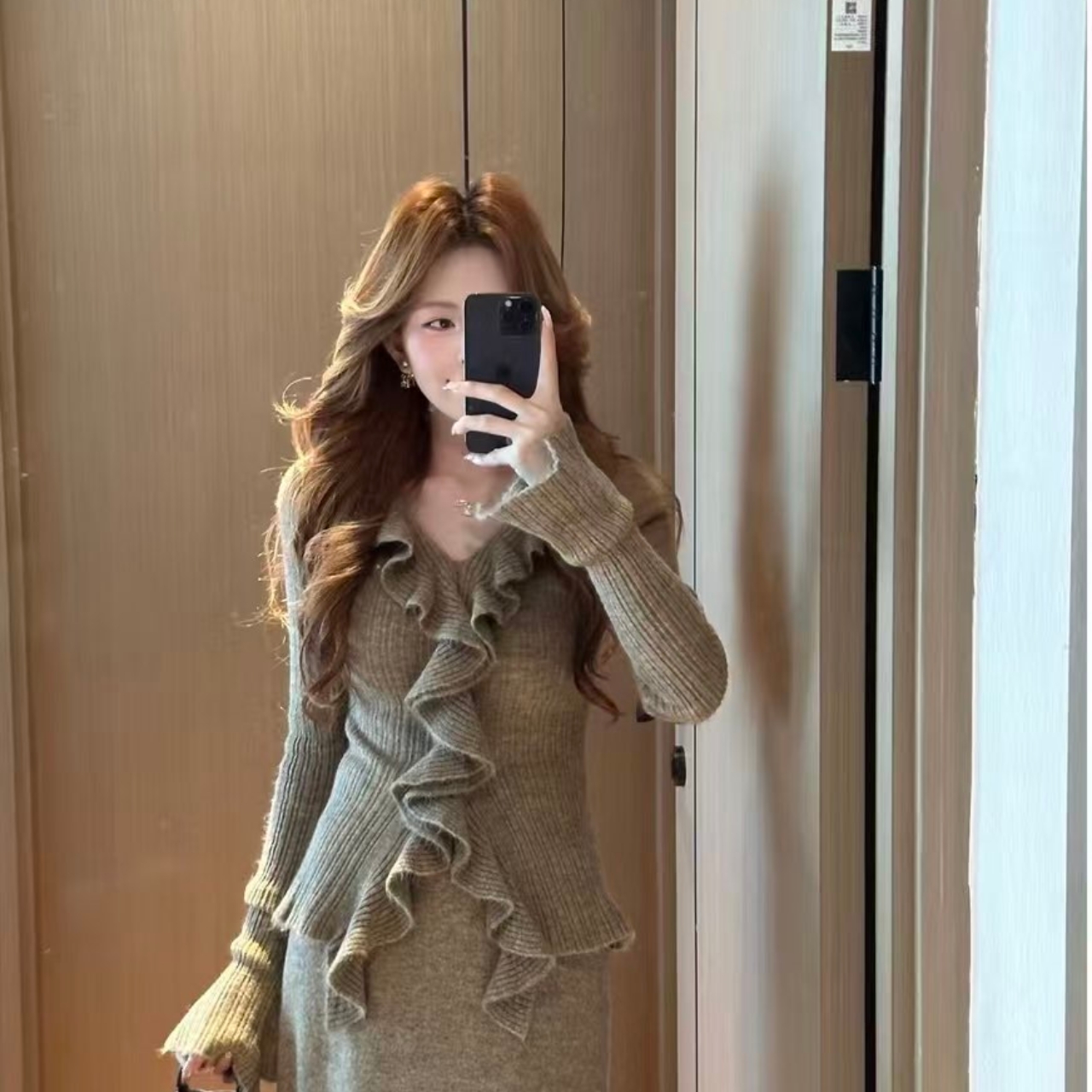 V领毛衣洋气设计感荷叶边上衣半身裙两件套秋秋新款温柔针织套装