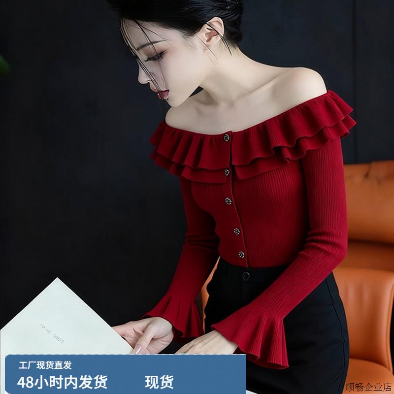 法式复古荷叶边针织衫女款秋季紫色喇叭袖打底毛衣超仙一字肩上衣