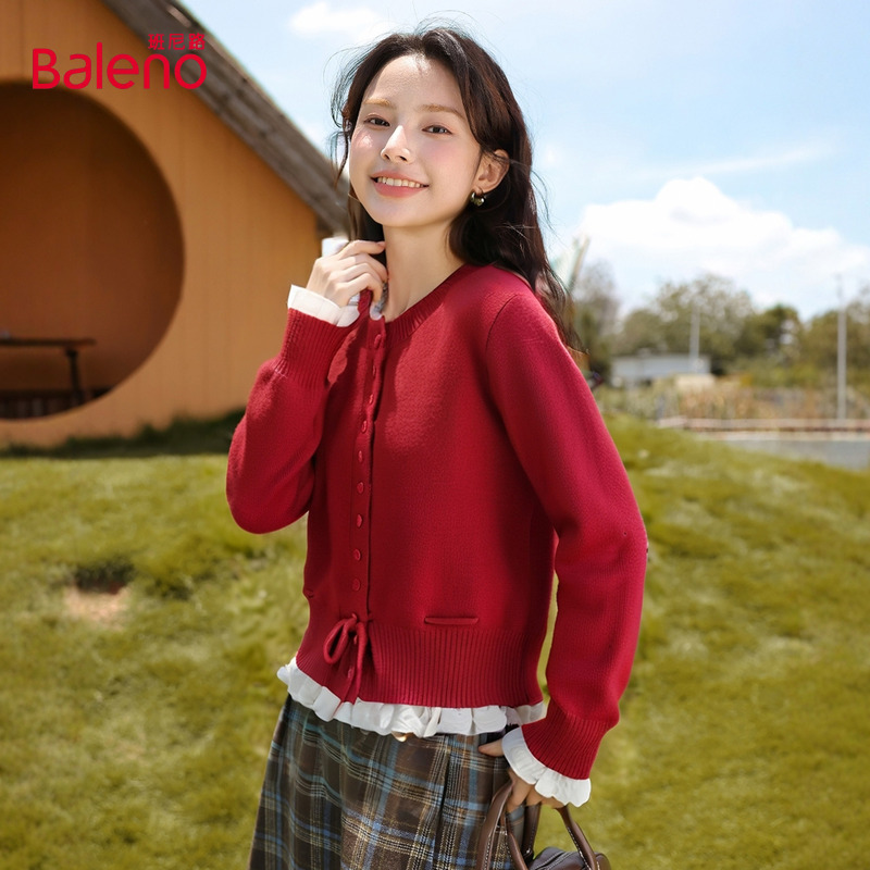 班尼路红色撞色荷叶边针织毛衣外套女款2025秋冬新款针织衫上衣H