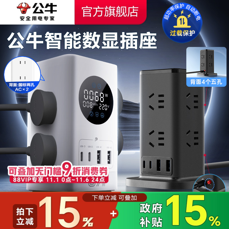 公牛小电舱快充智能数显立式插座多功能办公接线板插排多孔拖线板