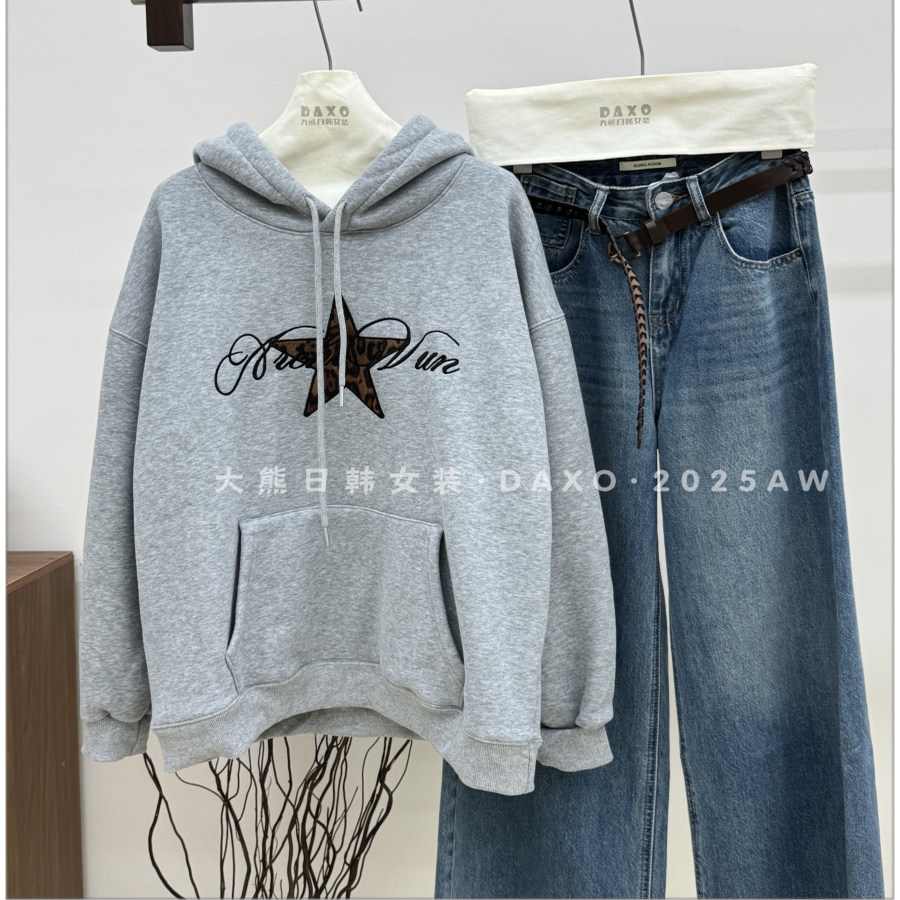韩国ins博主同款加绒连帽卫衣2025冬新款豹纹星星刺绣宽松帽衫女