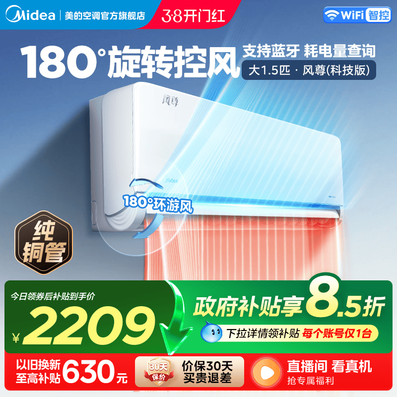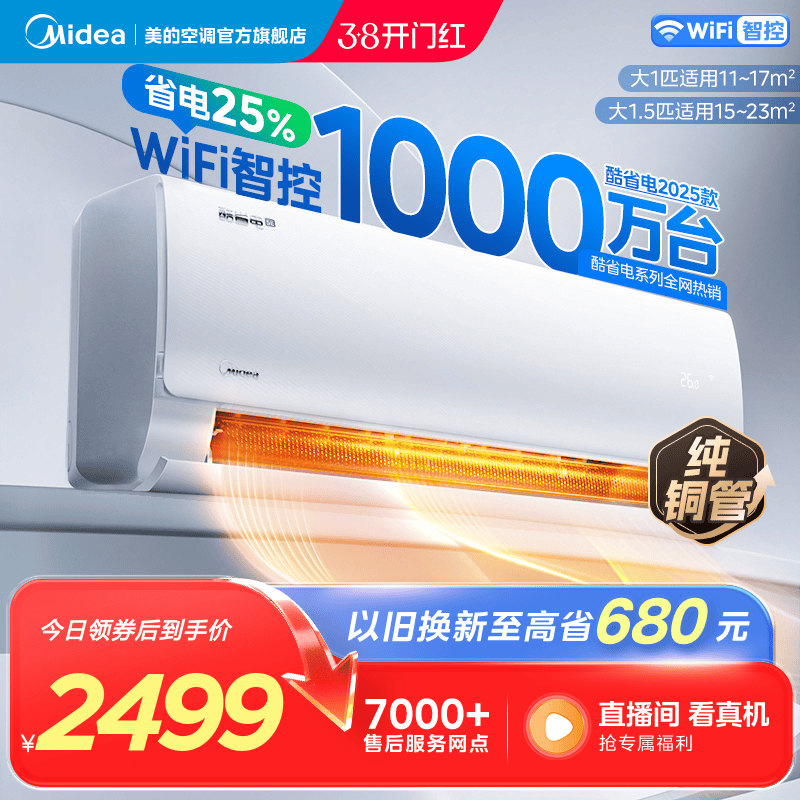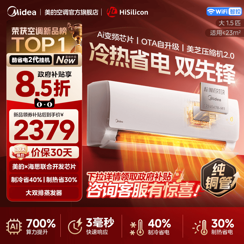 美的官方正品酷省电二代新款空调一级卧室1.5匹家用变频冷暖挂机