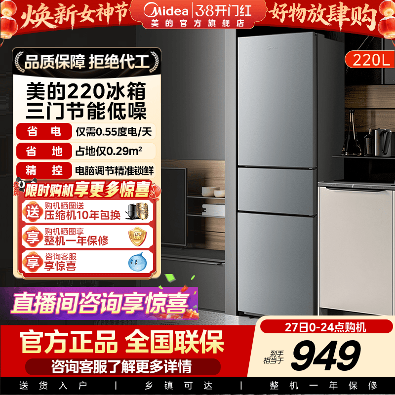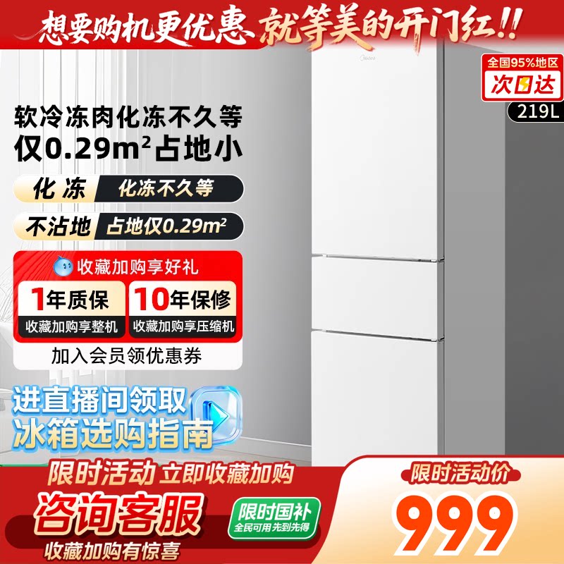 美的官方正品220L三门冰箱小型家用宿舍租房低噪冷冻冷藏节能冰箱