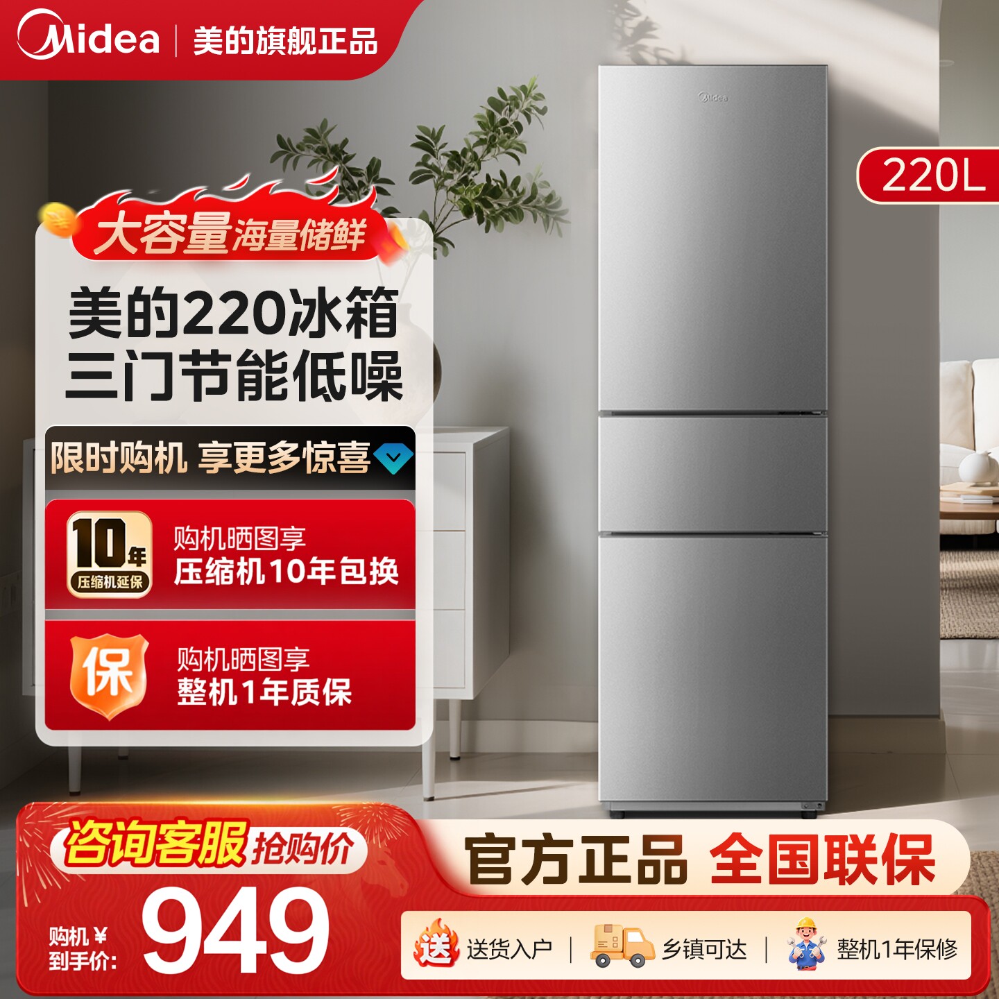 美的官方220L三门电冰箱家用宿舍小型租房冷藏冷冻节能低噪冰箱