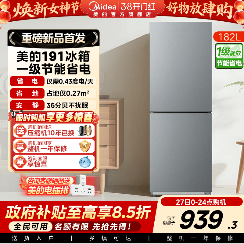 美的官方191租房宿舍节能低噪冷冻冷藏冰箱小型家用两门一级能效