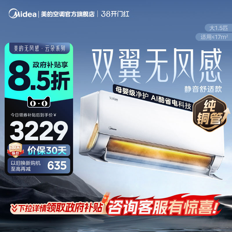 美的官方正品空调一级家用大1.5匹冷暖变频无风感云朵除湿挂机