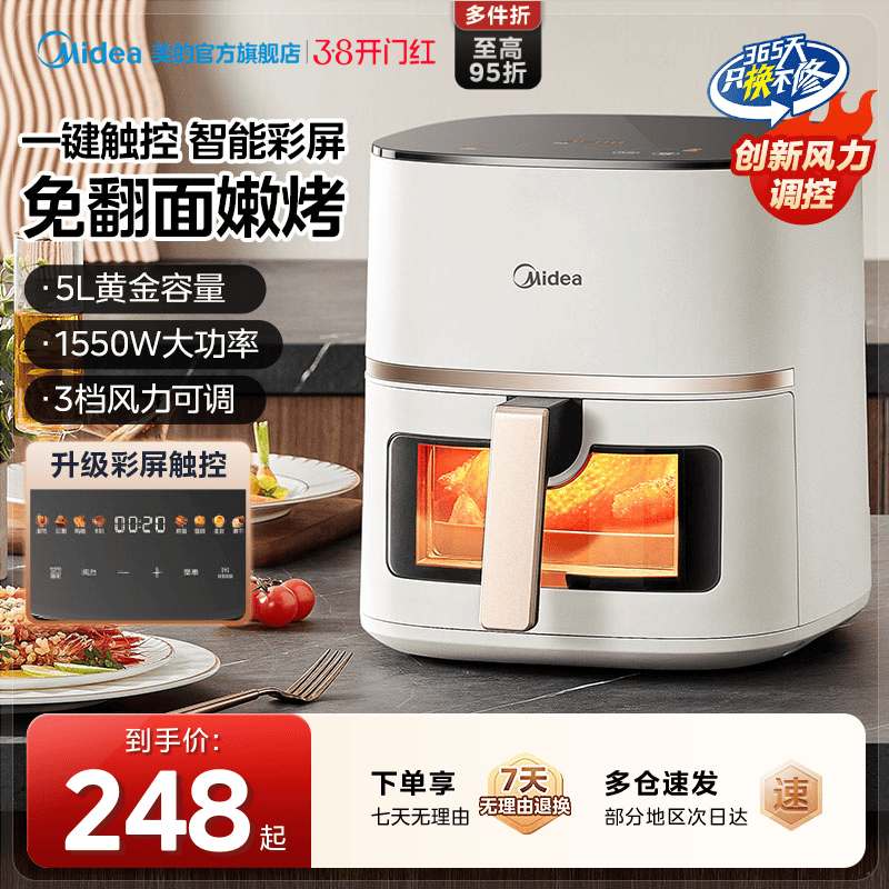 美的空气炸锅家用新款可视免翻面空气电炸锅烹饪机大容量官方华凌