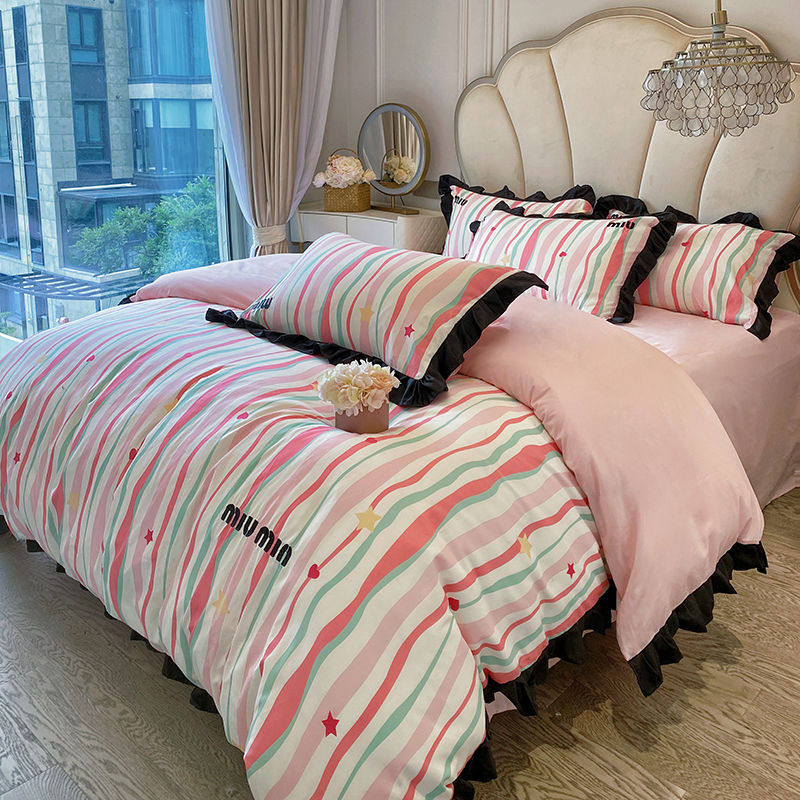 粉色条纹水洗棉花边床上四件套床单被套1.2米被套学生宿舍三件套