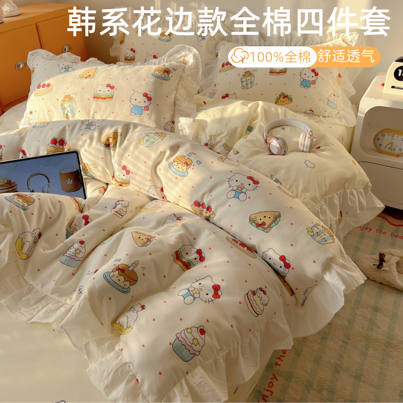 2026春夏款卡通全棉四件套韩系花边款床单被套1.2m宿舍三套件床笠