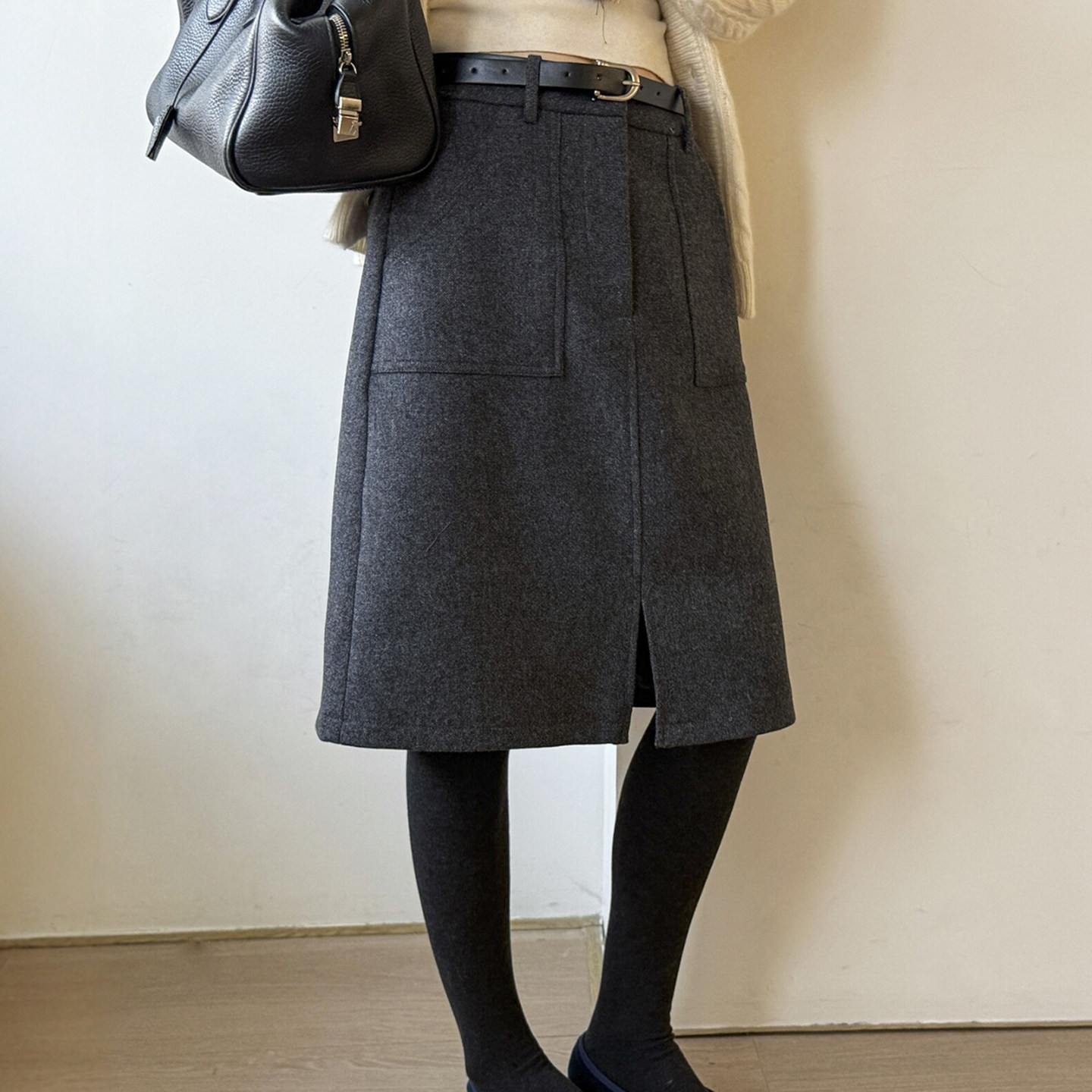 灰色毛呢中裙女配腰带2025秋冬高腰显瘦时尚a字裙百搭气质半身裙