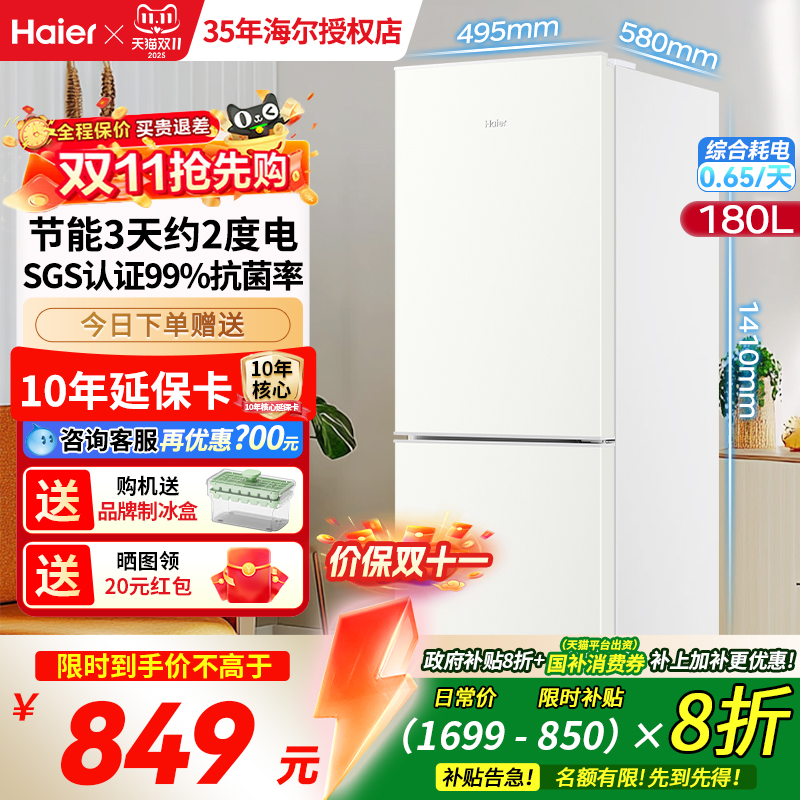 海尔冰箱双门家用180L小型宿舍租房冷冻冷藏超薄省电官方旗舰正品