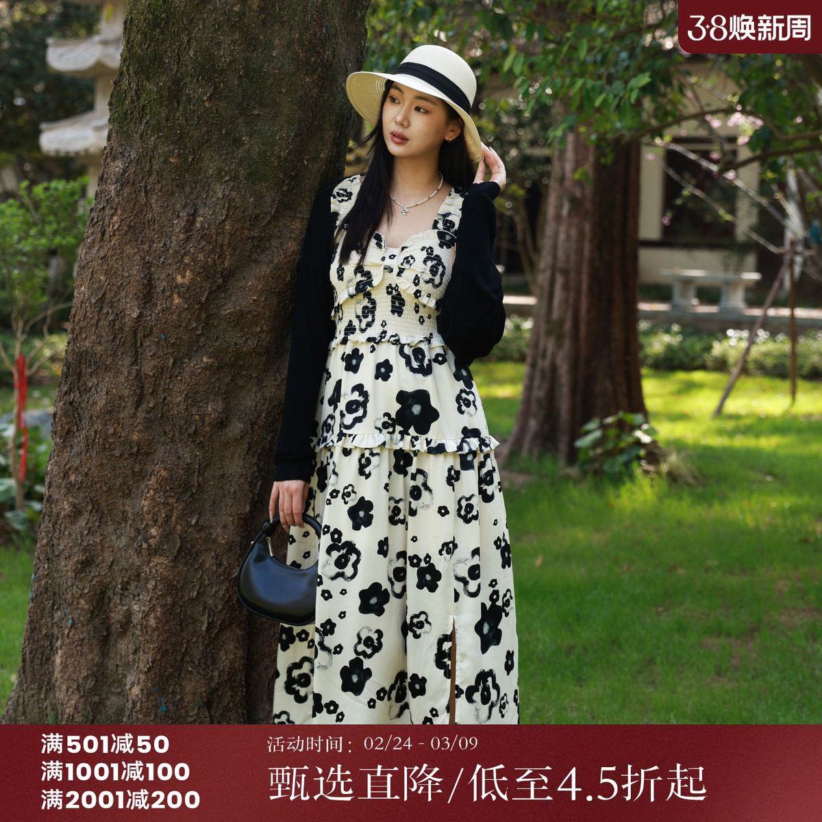 西町村屋法式吊带连衣裙女装春夏季新款气质长裙复古收腰碎花裙子
