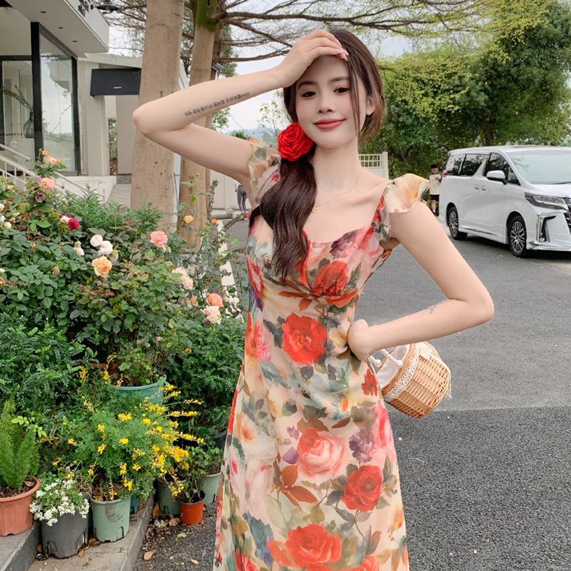 大码胖mm纯欲复古方领收腰碎花连衣裙女春夏气质显瘦海边度假长裙