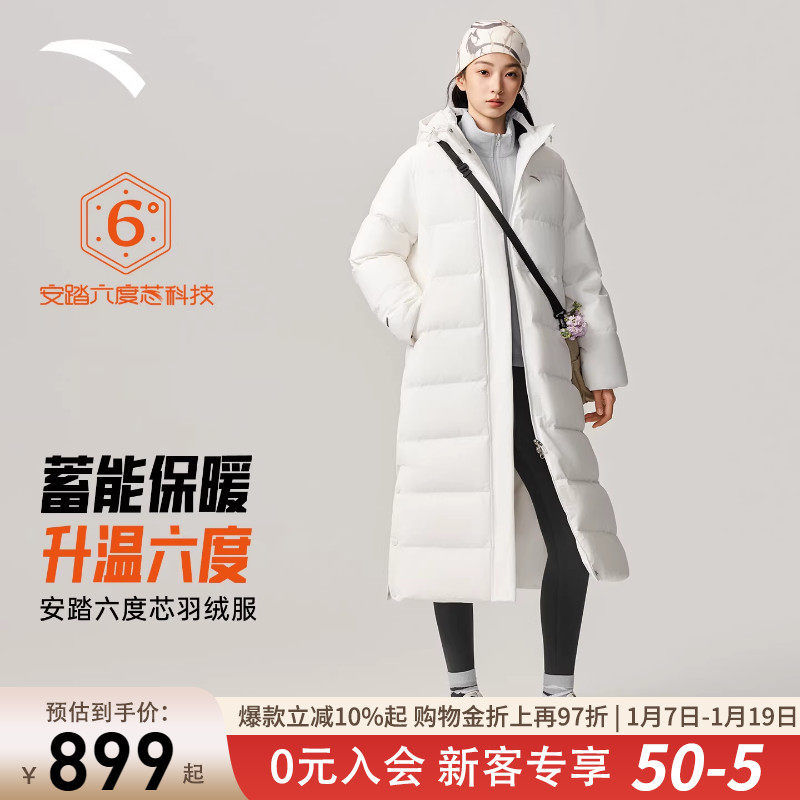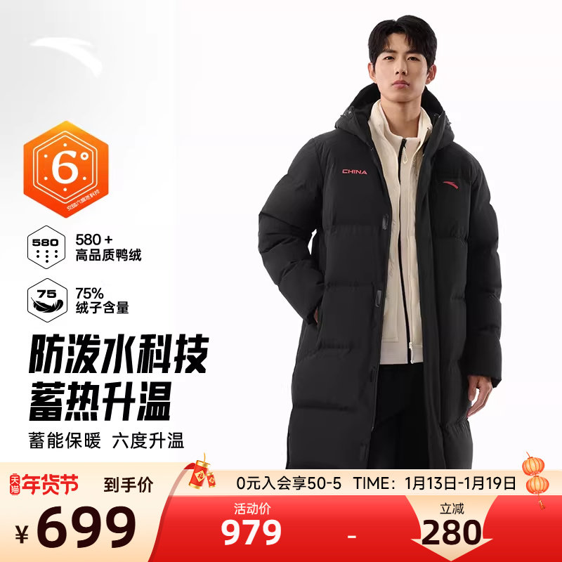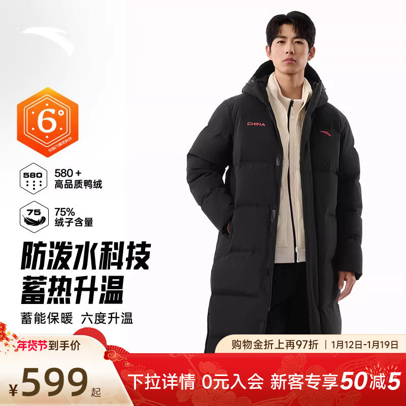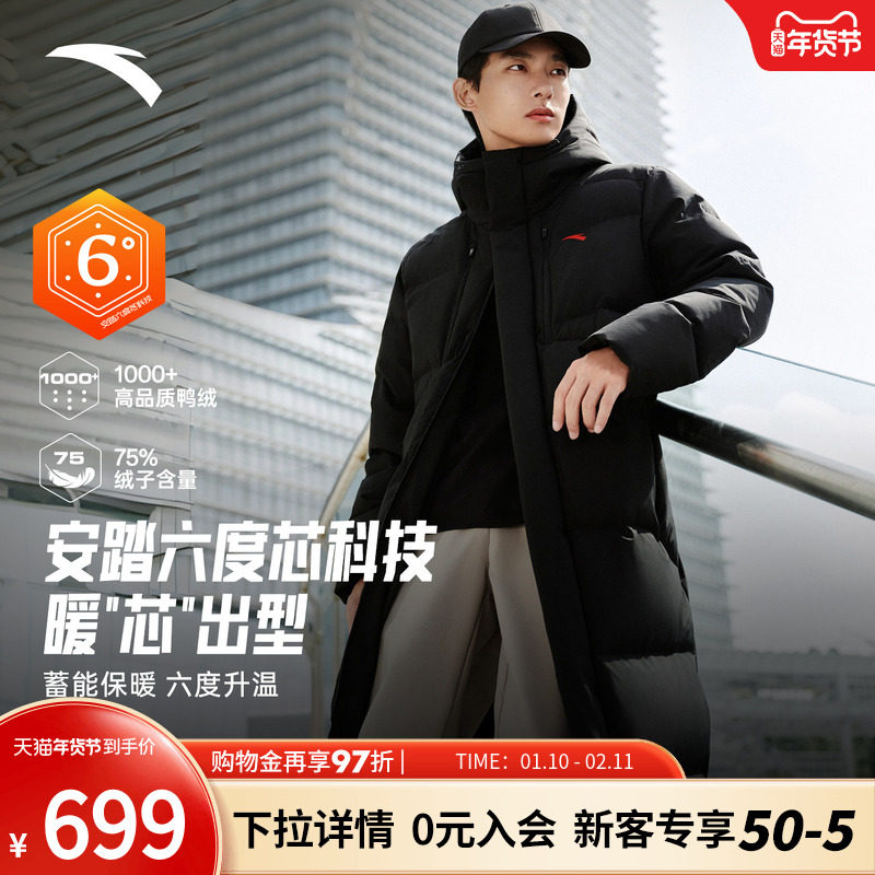 安踏六度芯羽绒服过膝长款运动羽绒服男士2026冬季防泼水保暖外套