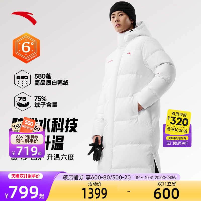 安踏六度芯羽绒服过膝长款运动羽绒服男士2025冬季防泼水保暖外套