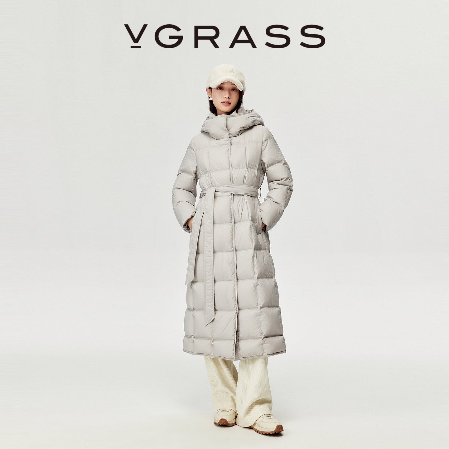 VGRASS25秋冬新款蓬松大朵白鹅绒连帽立领宽松面包羽绒服过膝长款
