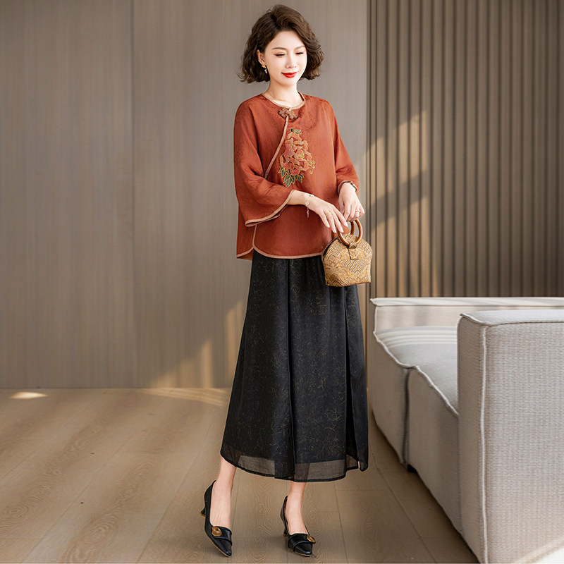 香云纱国风套装中式真丝上衣半身裙刺绣花两件套桑蚕丝夏季妈妈装