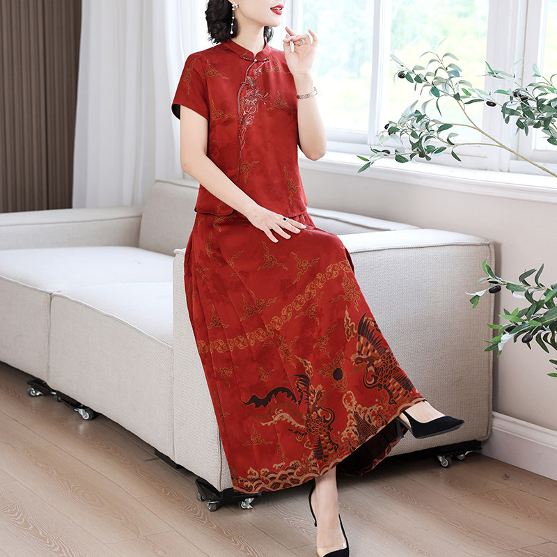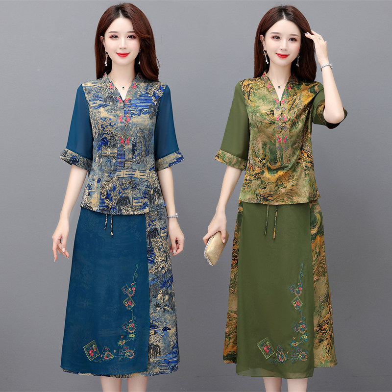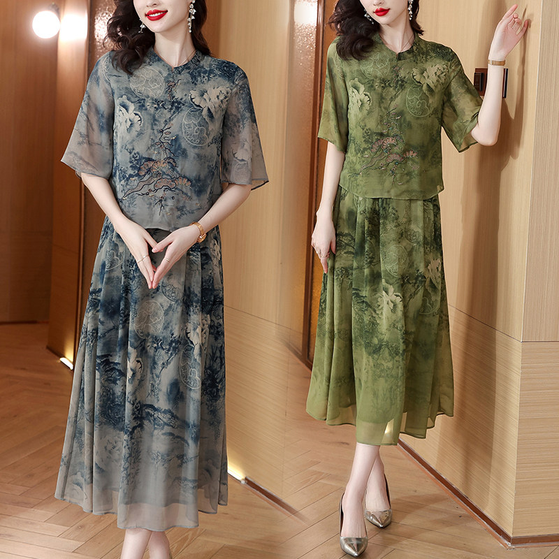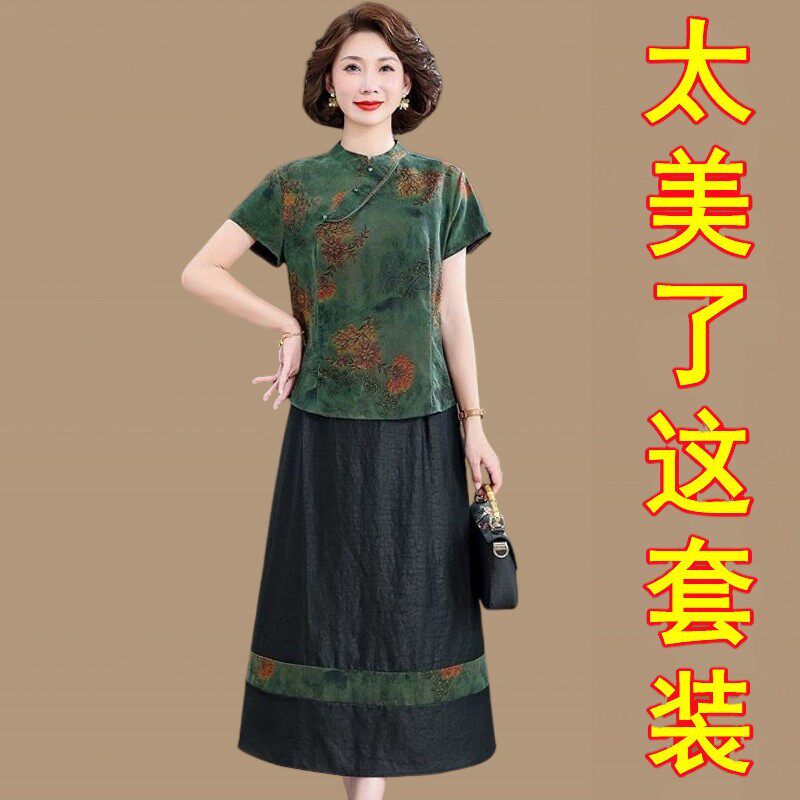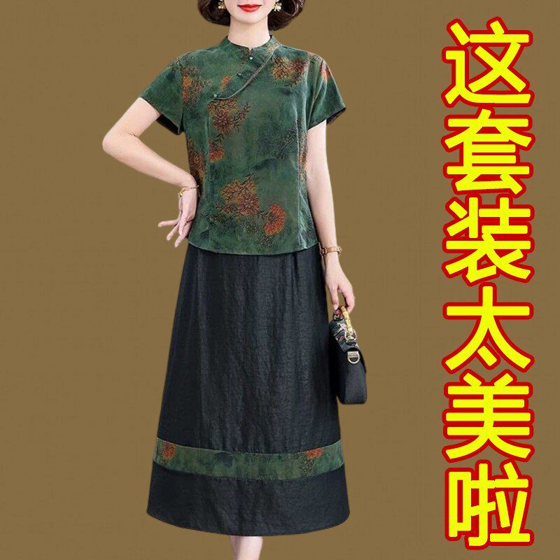 夏季国风两件套妈妈装真丝改良旗袍复古时尚香云纱上衣半身裙套装