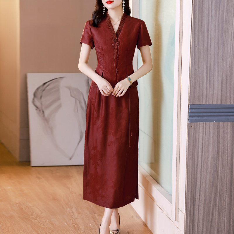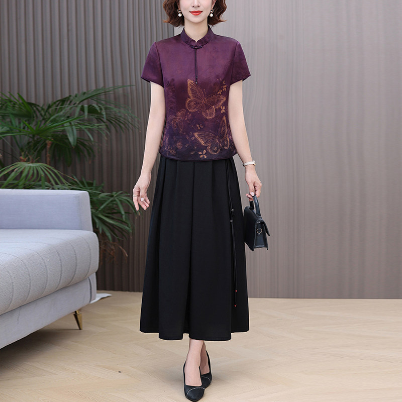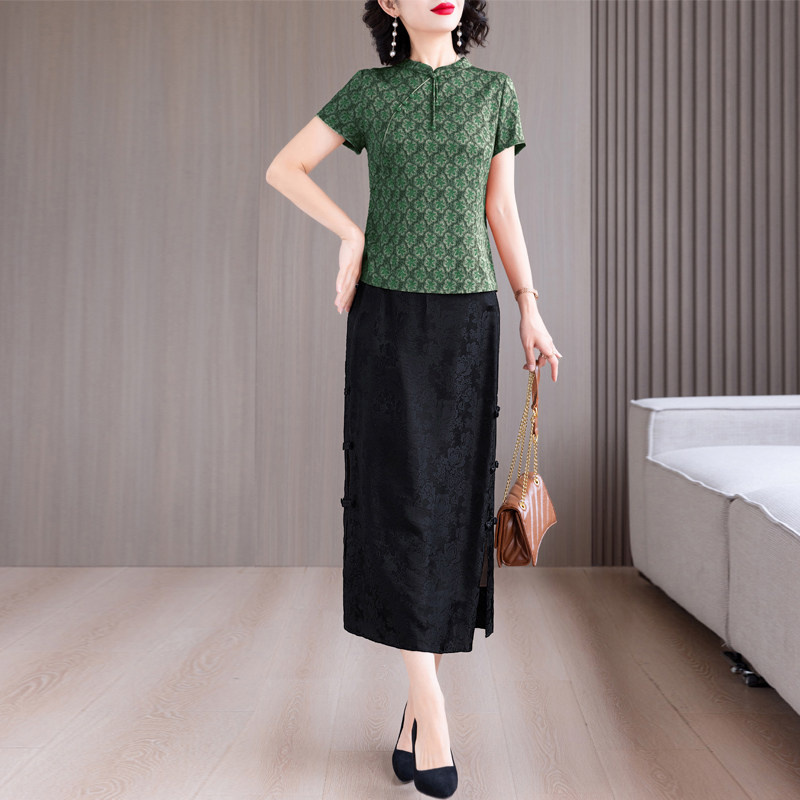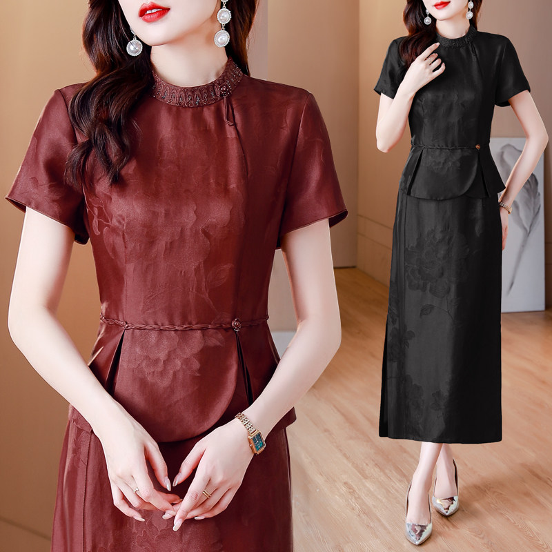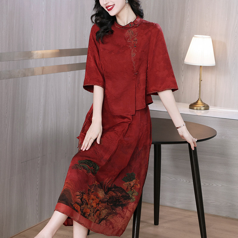 夏季国风两件套妈妈装真丝改良旗袍复古时尚香云纱上衣半身裙套装
