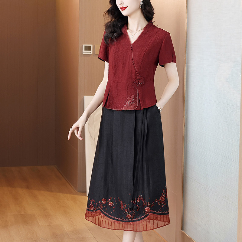 香云纱新中式国风刺绣套装上衣半身裙子夏季真丝妈妈桑蚕丝女短袖