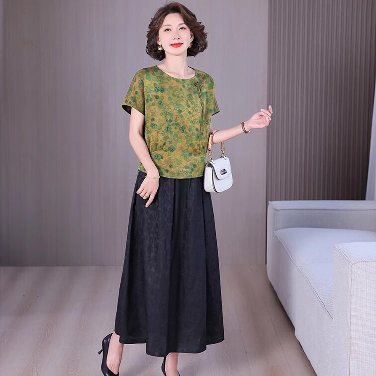 夏季时尚妈妈套装年轻款香云纱桑蚕丝上衣阔太太半身裙真丝两件套