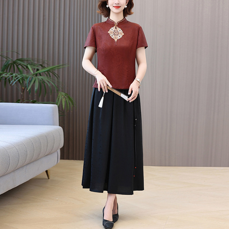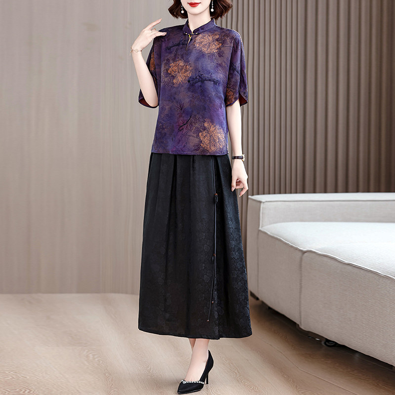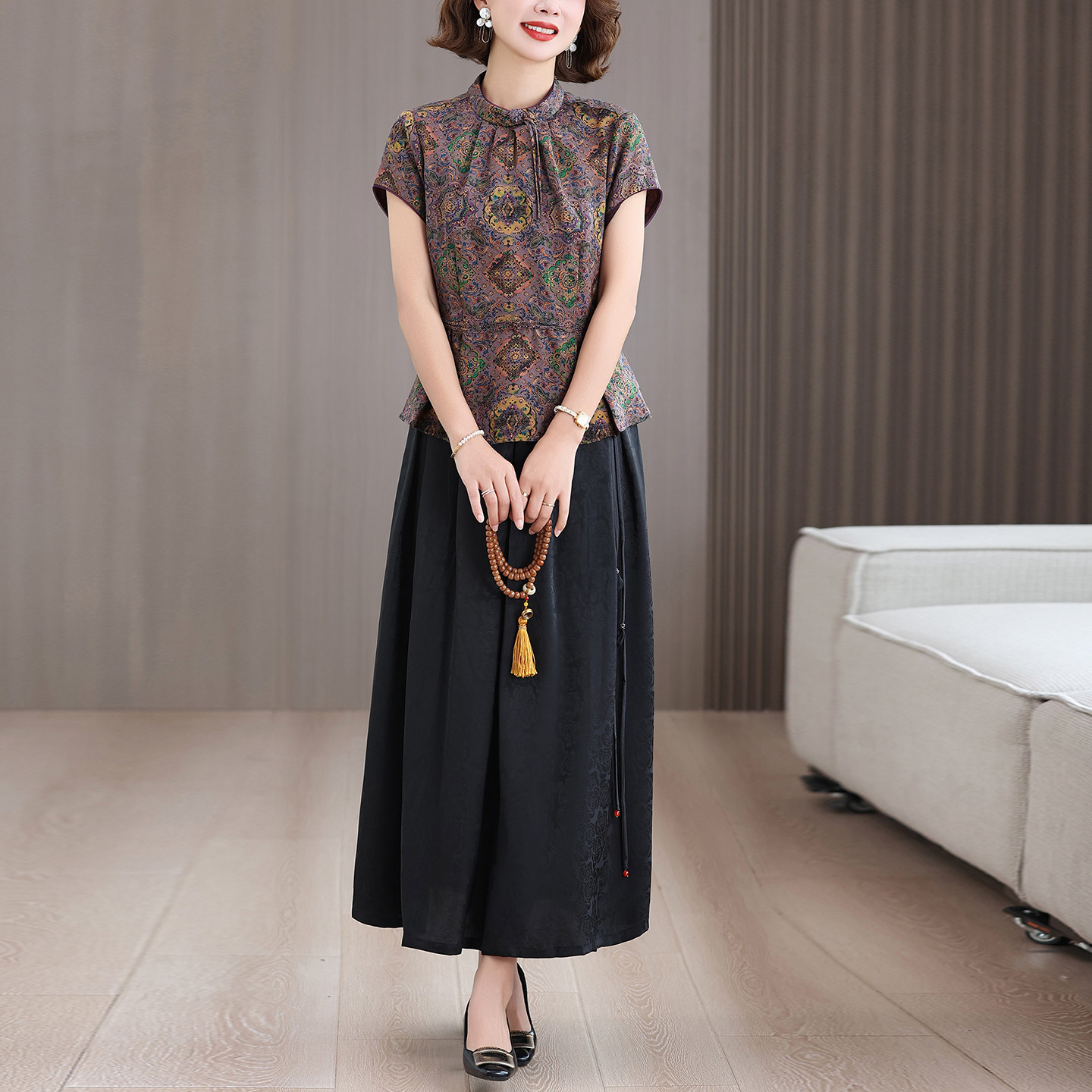 高端真丝香云纱国风套装女士夏季妈妈装立领显瘦上衣半身裙两件套