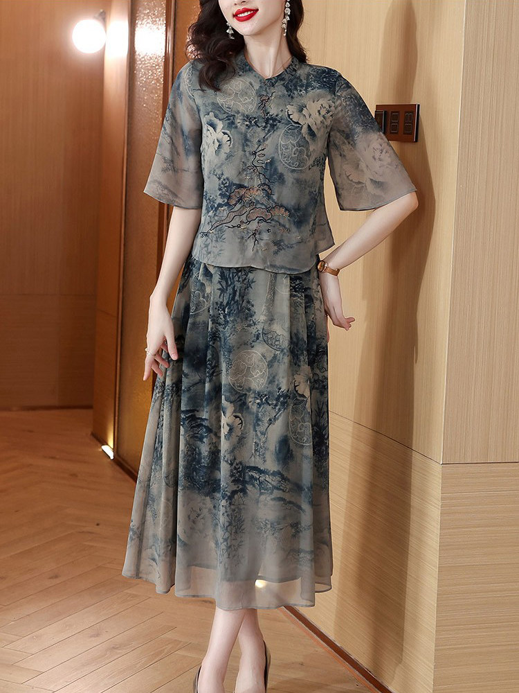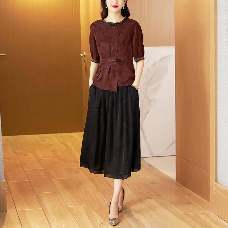 香云纱复古盘扣真丝两件套立领上衣短袖夏季碎花半身裙桑蚕丝套装