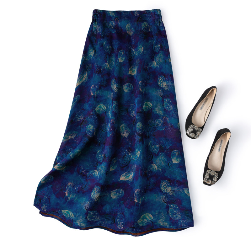 静谧深蓝调树叶印花!真丝花罗香云纱松紧腰半身裙桶裙开叉包臀裙