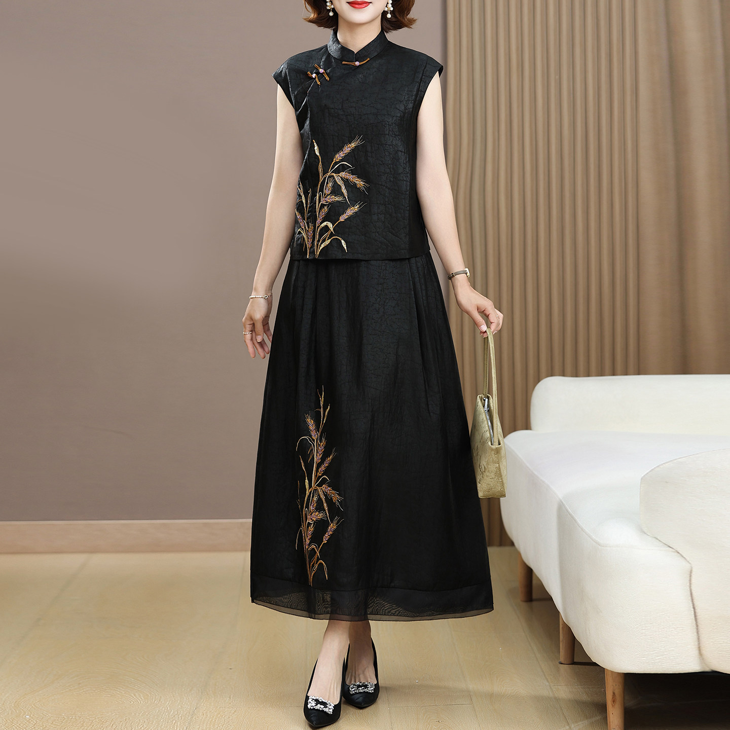 香云纱套装真丝连衣裙绣花两件套妈妈礼服桑蚕丝轻奢喜婆婆半身裙