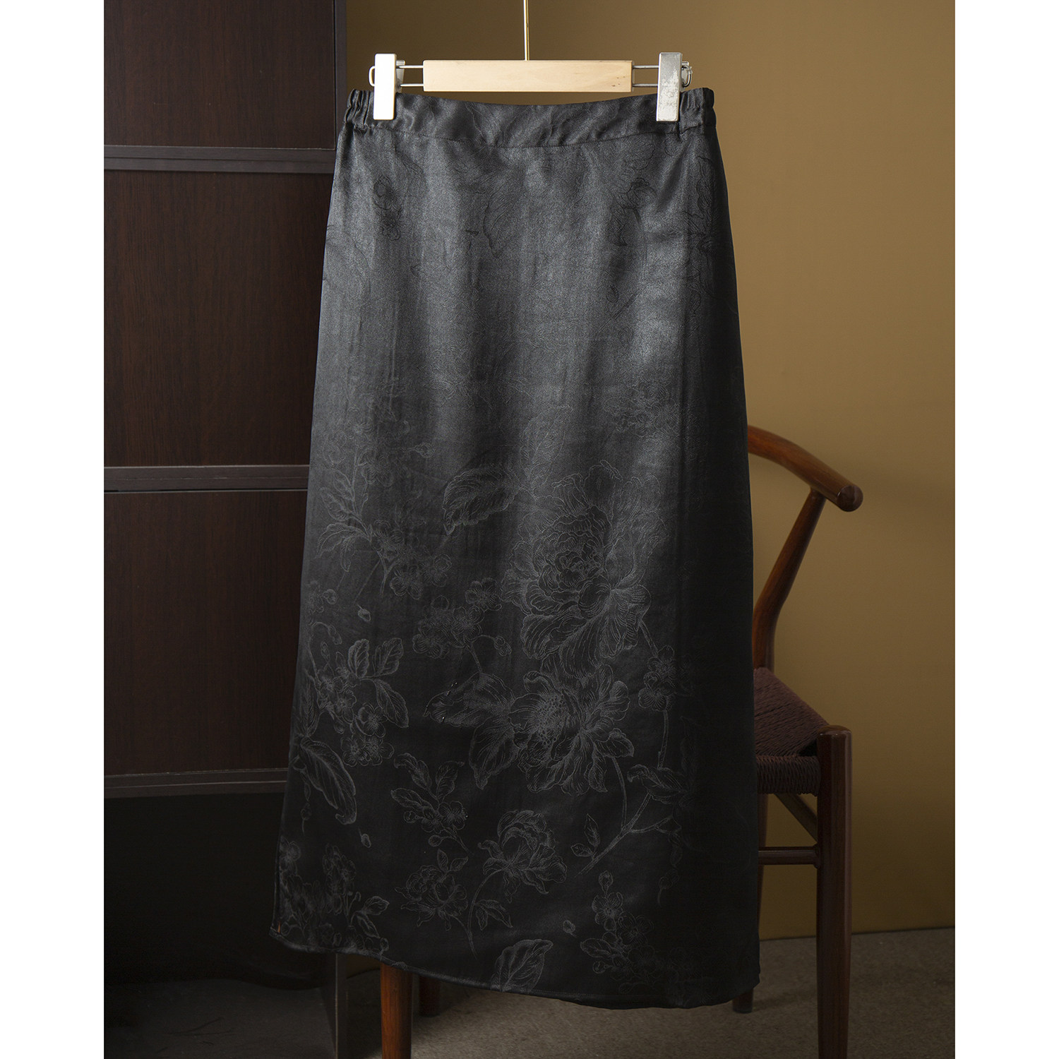 丝艺100%桑蚕丝小重缎香云纱提花下摆开叉半松紧腰真丝半身裙长裙