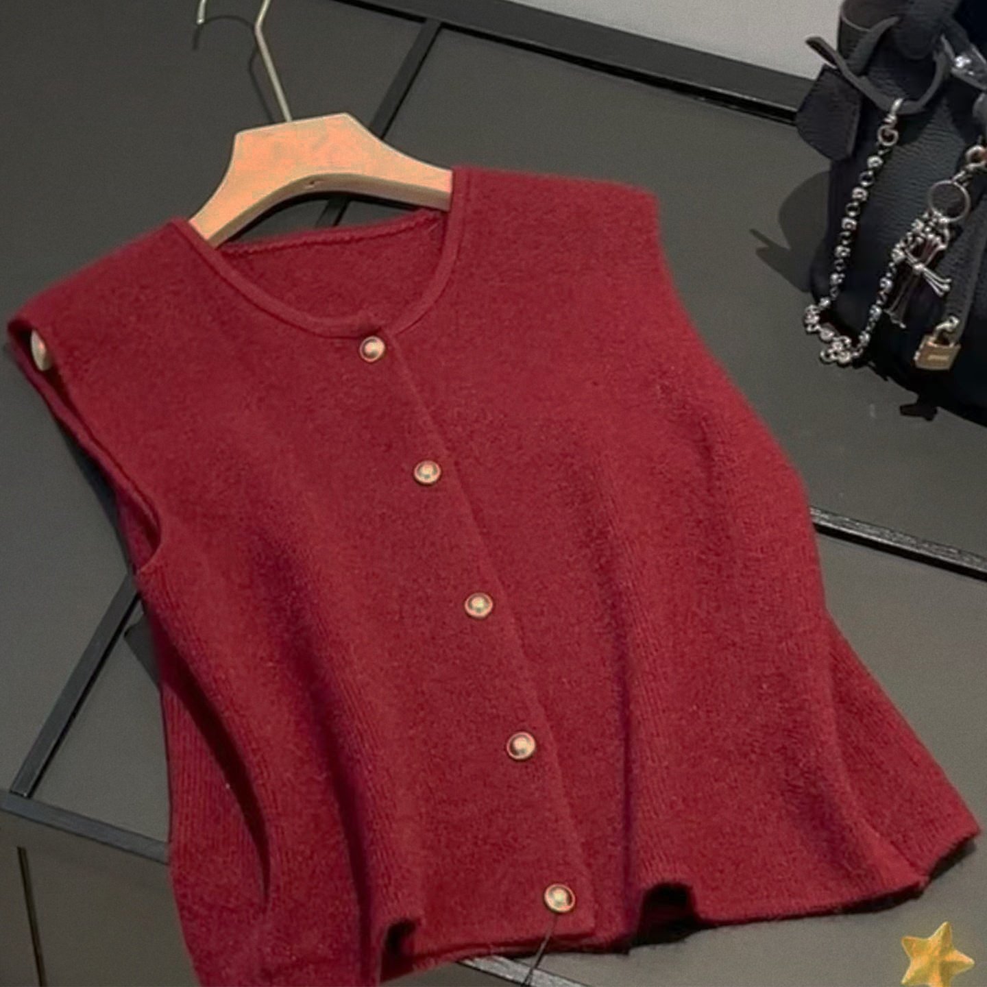 特价软糯~幸运红色100纯羊毛开衫背心无袖马甲金扣针织坎肩女叠穿
