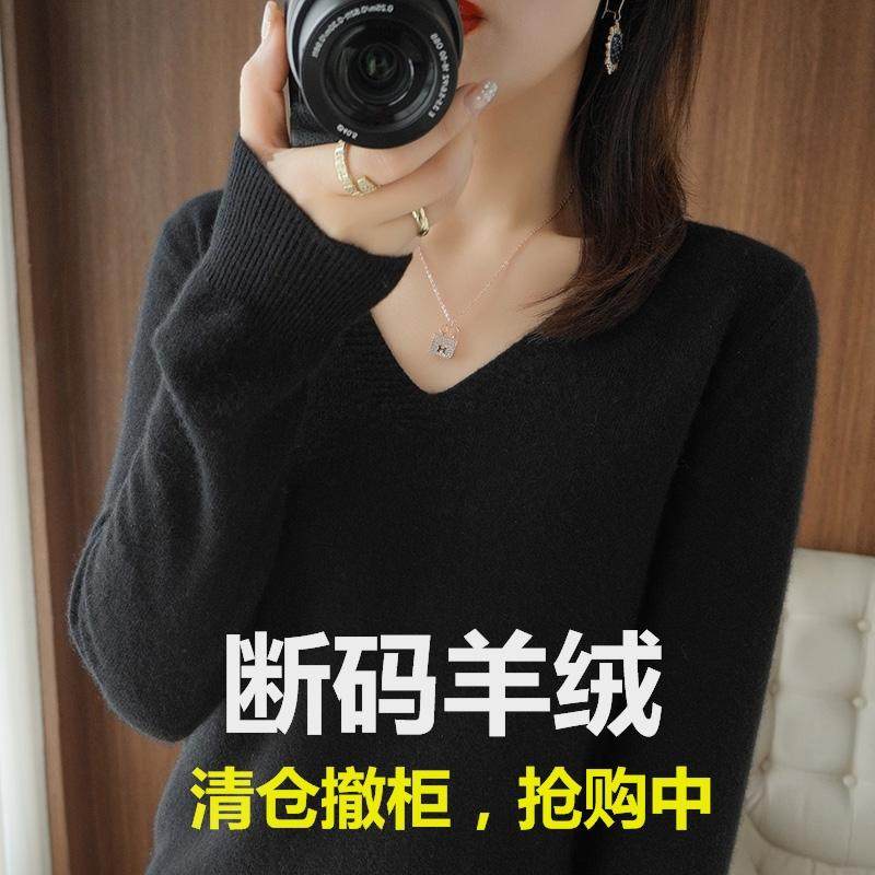 特价清仓秋季薄款羊绒衫女士V领短款套头毛衣纯色长袖针织打底衫