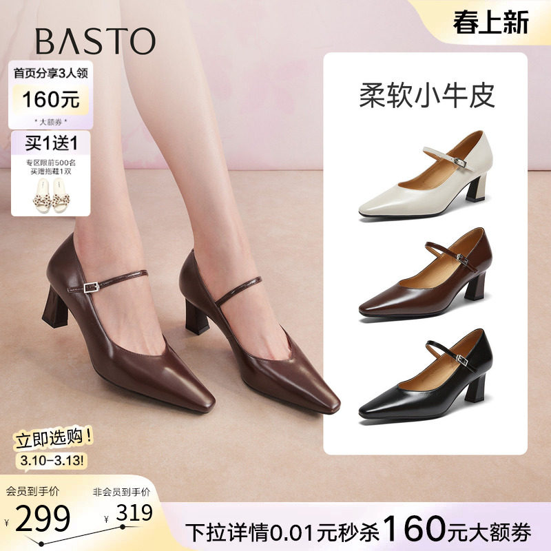 百思图2026春季新款法式玛丽珍鞋尖头粗高跟女浅口单鞋BN982AQ6