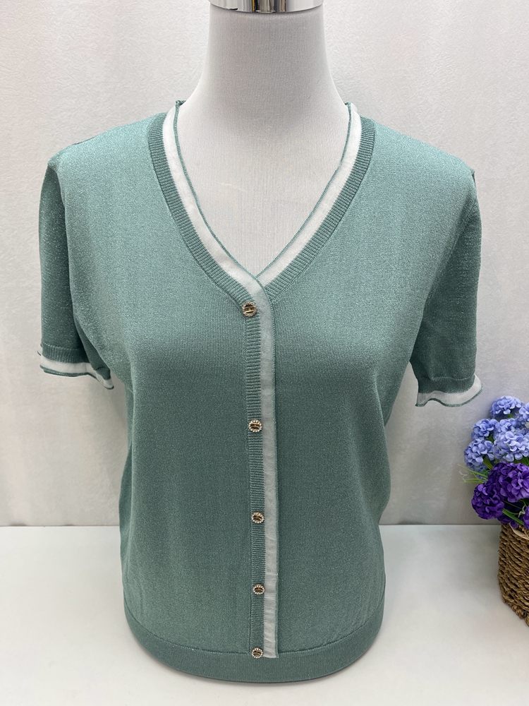 年轻妈妈装女上衣拼色气质宽松短袖上衣女小衫2025春夏新款薄针织