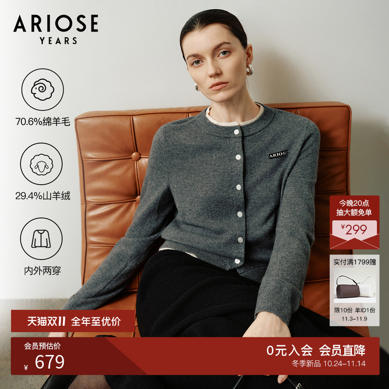 艾诺丝雅诗【Miu风小衫】羊毛&羊绒撞色领口针织开衫女冬41018013