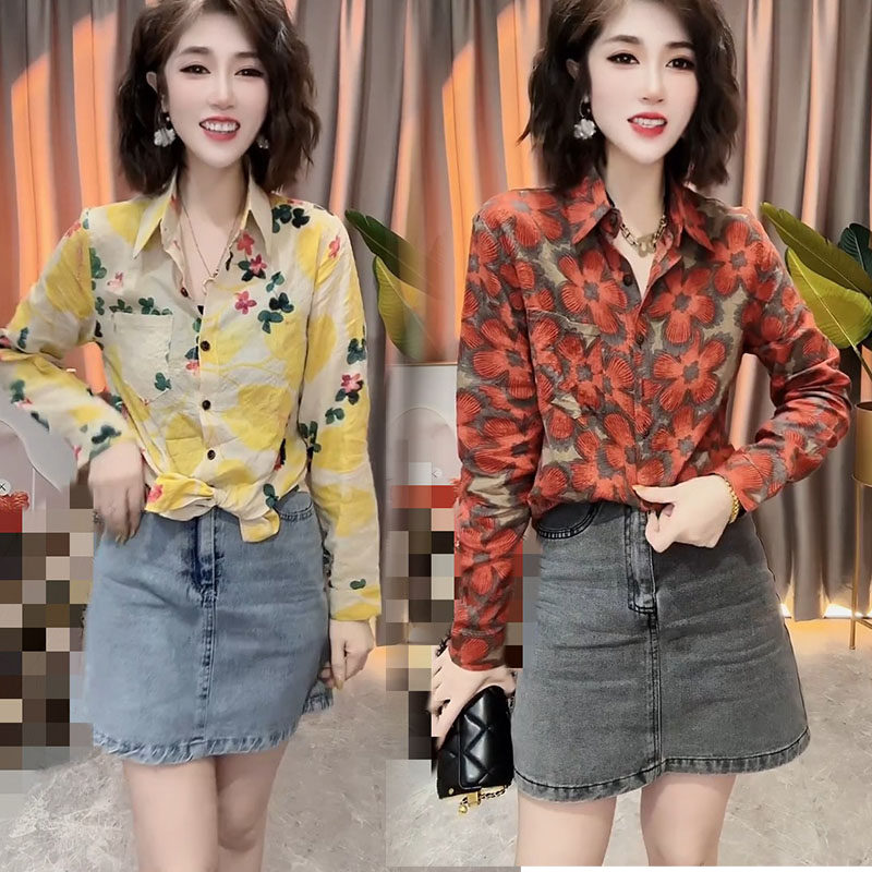 衬衫2023年春季新款花色洋气时尚韩版翻领百搭女小衫牛仔半身裙潮