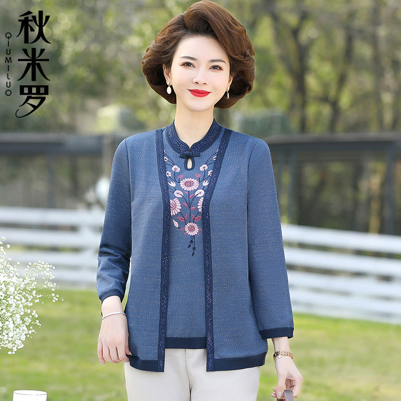 妈妈秋装假两件洋气2025新款中年妇女小衫时尚中老年春秋刺绣上衣