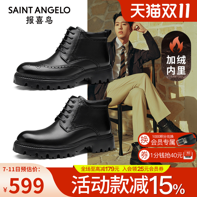 切尔西男靴冬季加绒保暖商务休闲真皮高帮防滑厚底棉鞋布洛克短靴