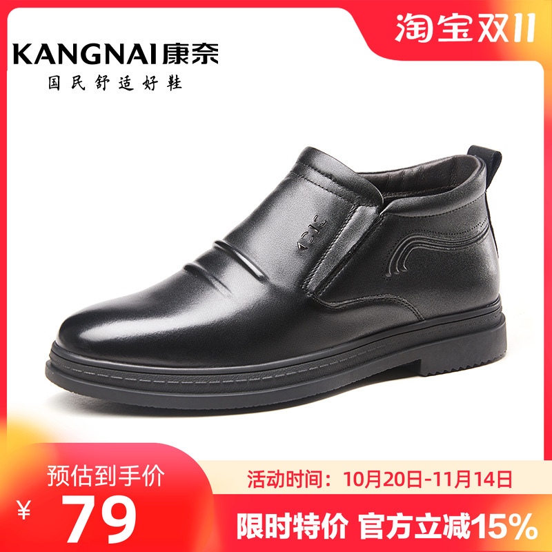 康奈男靴冬季新款真皮商务休闲保暖棉靴男款素面加绒棉靴防寒毛靴