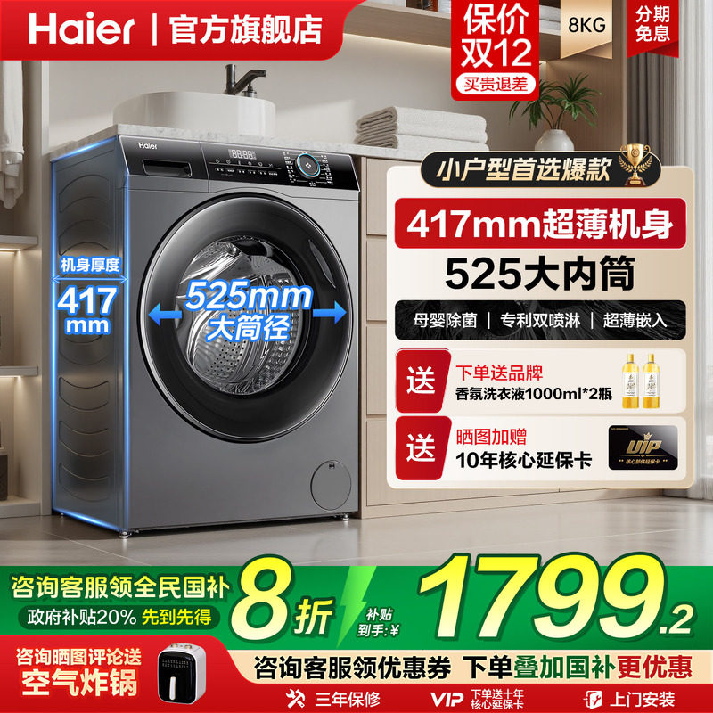 海尔超薄滚筒洗衣机40cm纤薄款8/9/10kg全自动烘干小户型家用统帅