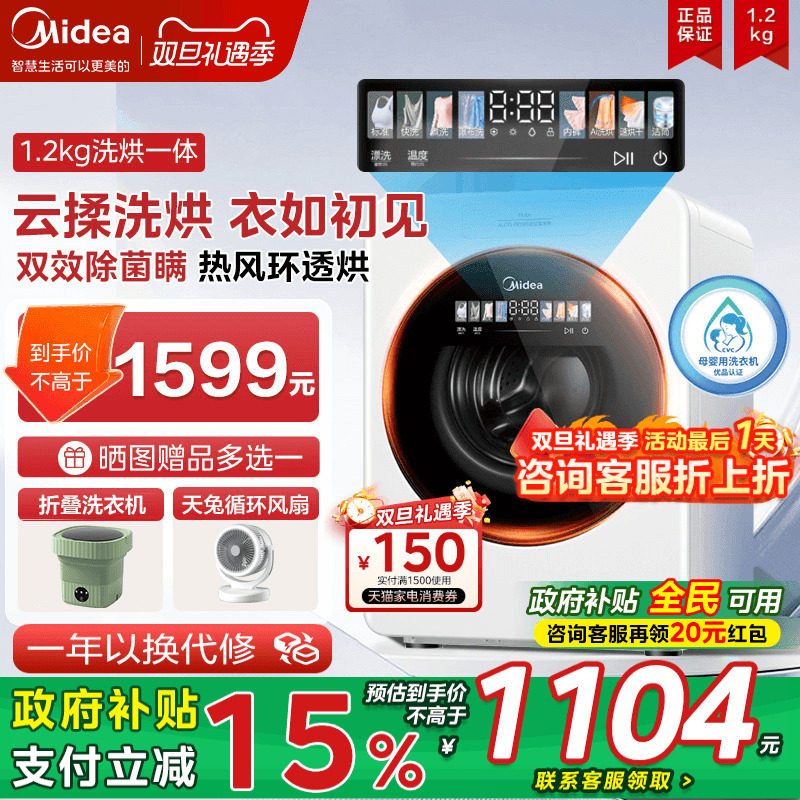 美的10/12KG全自动洗脱烘干一体滚筒洗衣机变频家用大容量