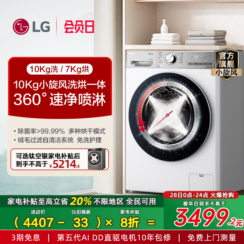 [全民补贴]LG洗烘一体机10Kg小旋风全自动家用洗衣机带烘干10D4WA