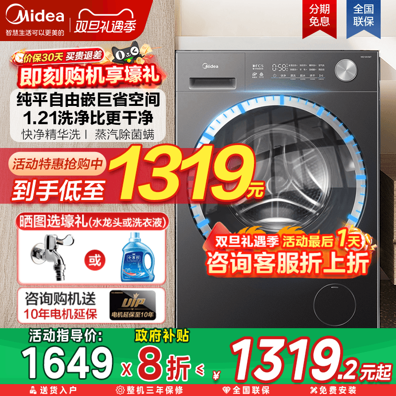 美的12kg滚筒洗衣机一级大容量洗脱10公斤家用全自动除菌烘干V36T
