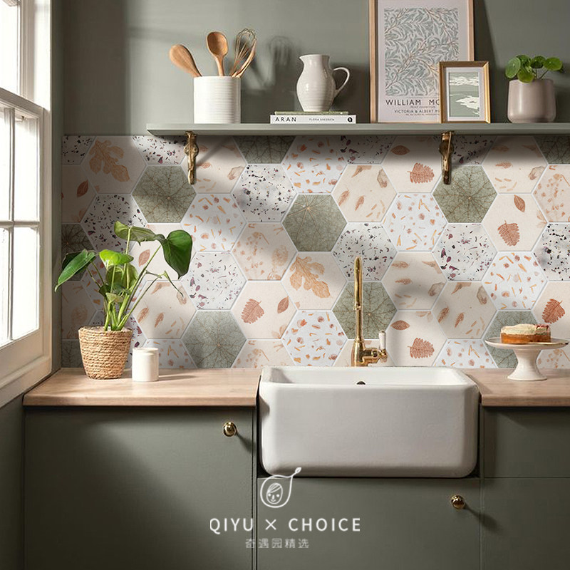 跨境热卖北欧复古六角瓷砖贴浴室厨房加厚地贴DIY拼接墙贴定制