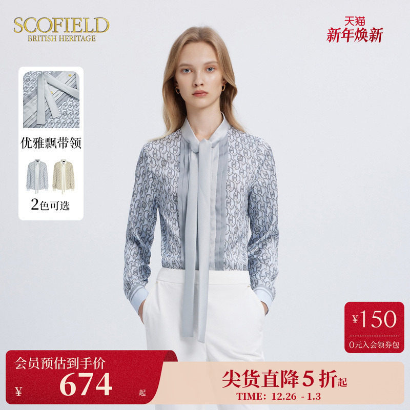 Scofield女装蝴蝶结飘带领压褶雪纺衫优雅锁链logo印花衬衫秋季