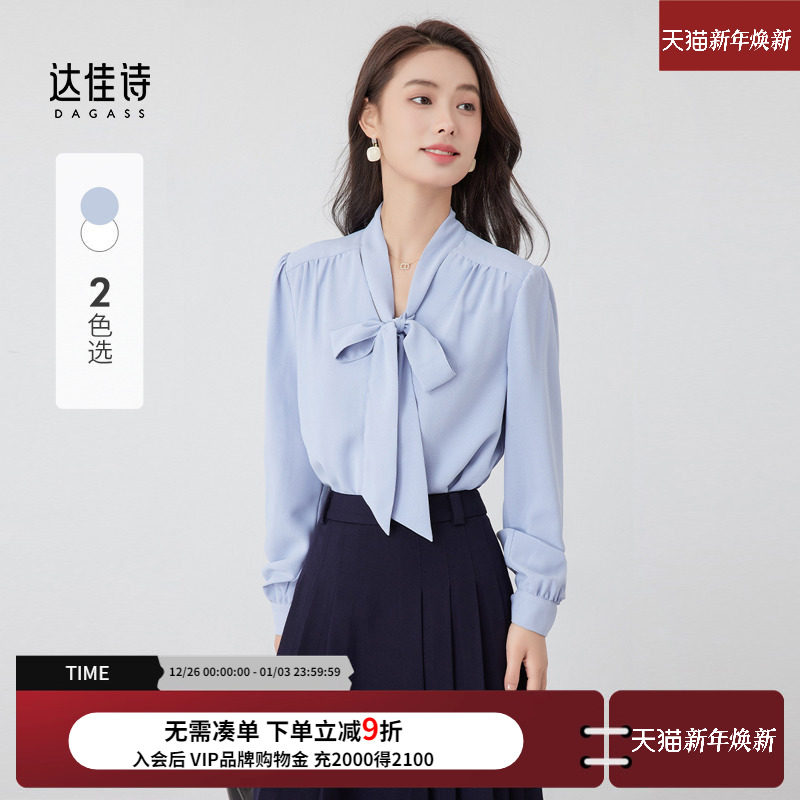 达佳诗蓝色衬衫女蝴蝶结飘带领雪纺上衣面试职场通勤穿搭长袖衬衣