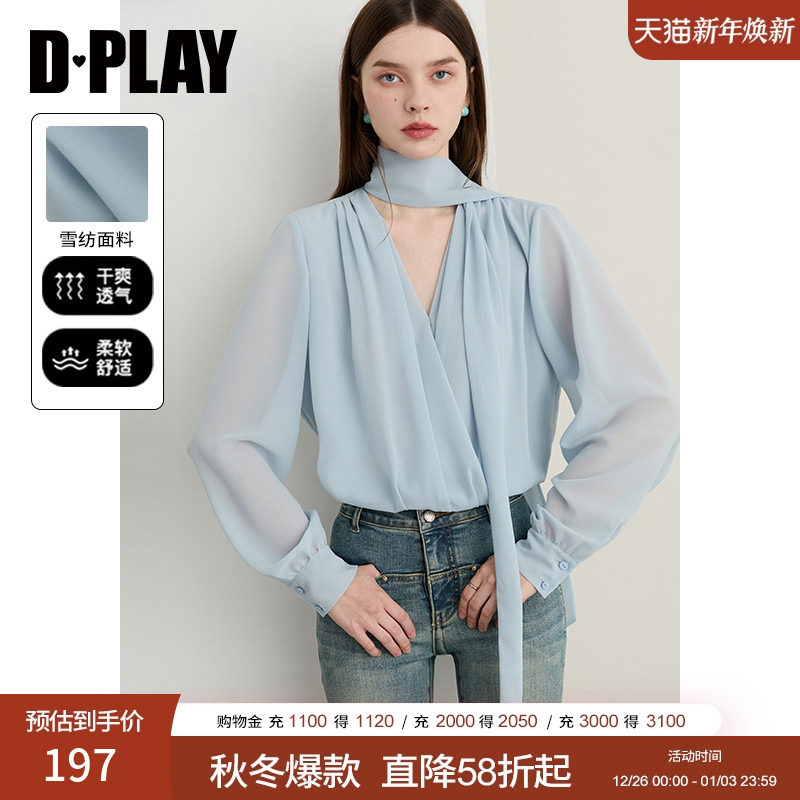 DPLAY2025年秋季新款蓝色衬衫女宽松雪纺衬衣蝴蝶结飘带长袖上衣